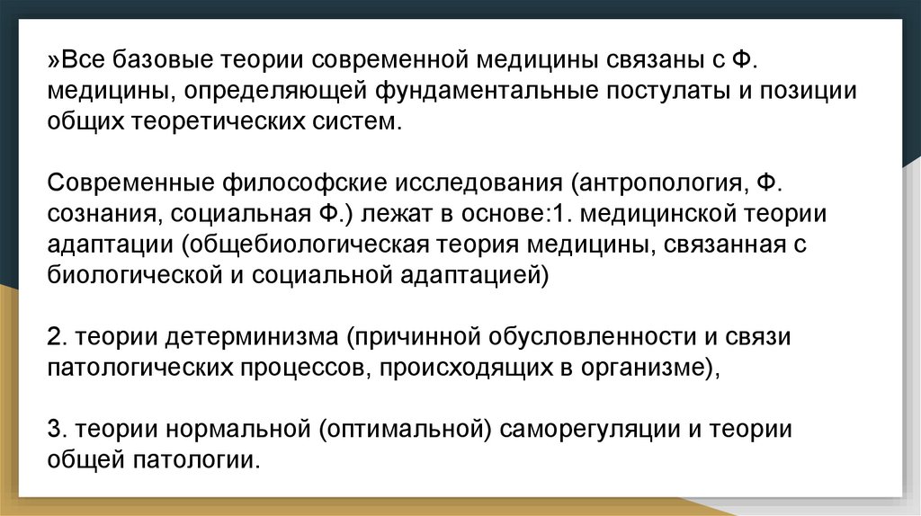 »Все базовые теории современной медицины связаны с Ф.медицины, определяющей фундаментальные постулаты и позиции