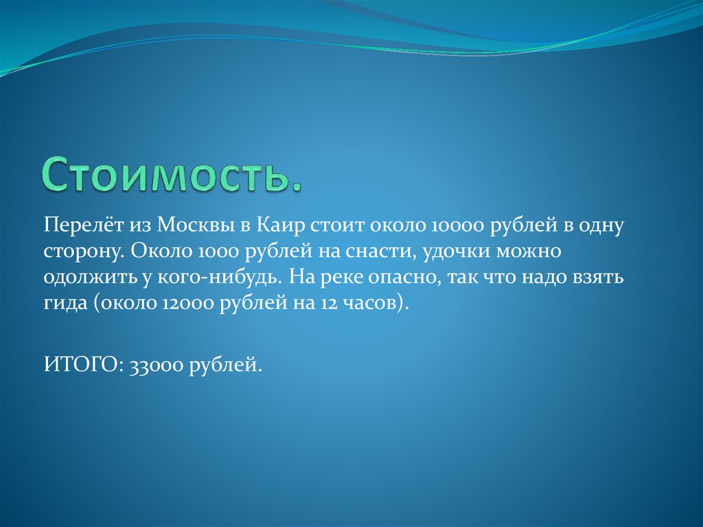 Перелёт из Москвы в Каир стоит около 10000 рублей в однусторону. Около 1000 рублей на снасти, удочки можно