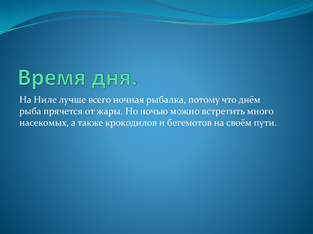 На Ниле лучше всего ночная рыбалка, потому что днёмрыба прячется от жары. Но ночью можно встретить много