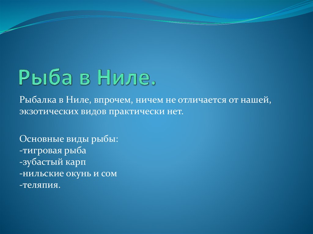 Рыбалка в Ниле, впрочем, ничем не отличается от нашей,экзотических видов практически нет.