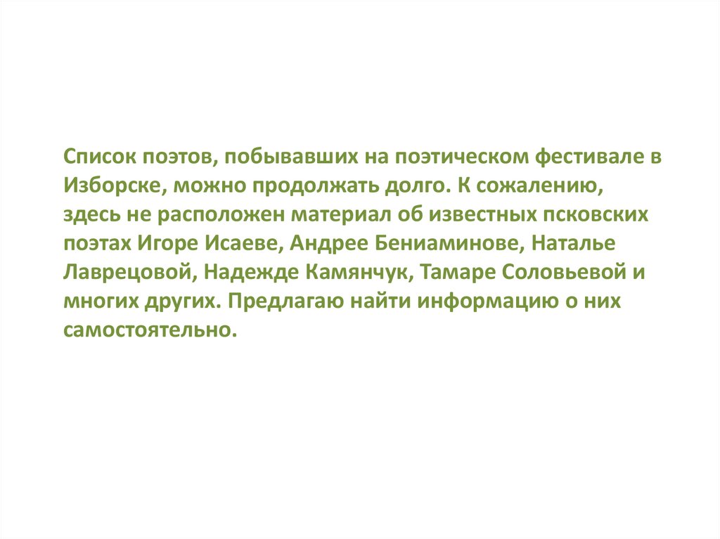 Список поэтов, побывавших на поэтическом фестивале вИзборске, можно продолжать долго. К сожалению,