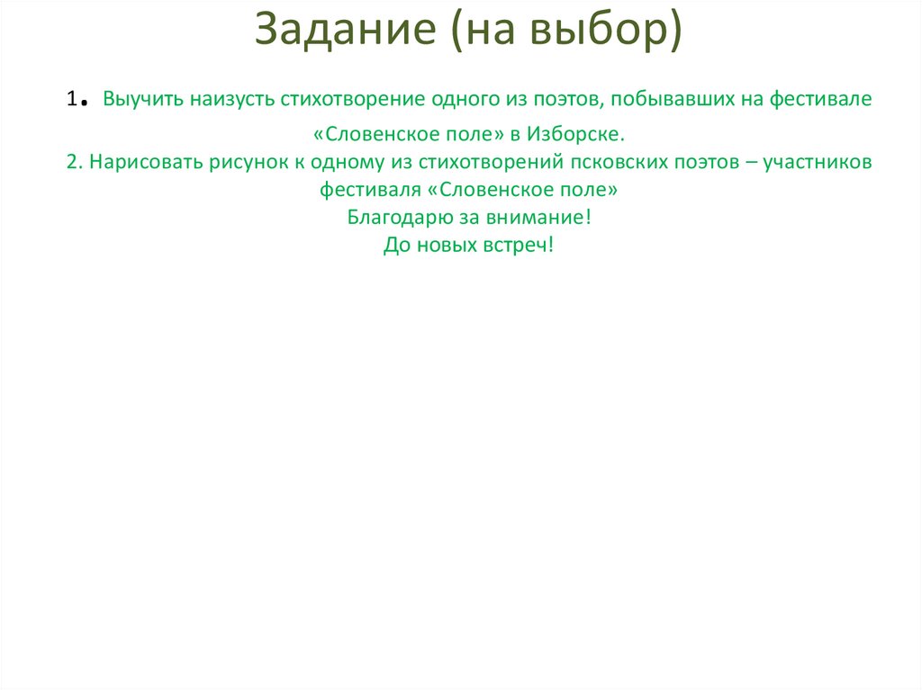Задание (на выбор). Выучить наизусть стихотворение одного из поэтов, побывавших на фестивале
