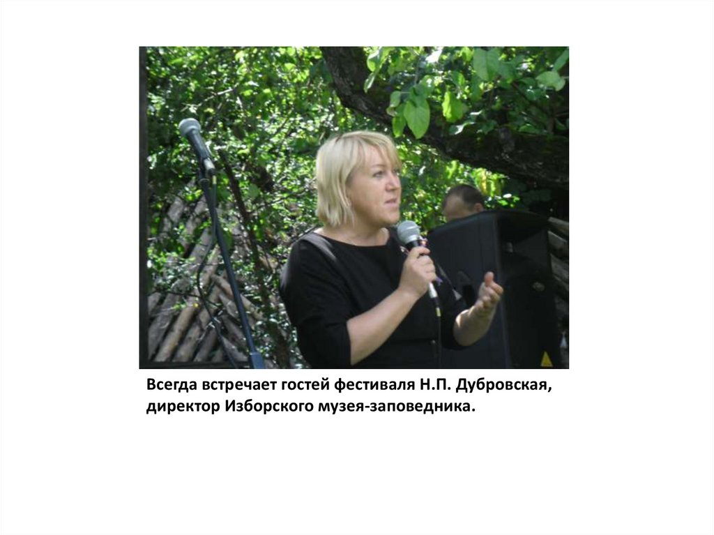 Всегда встречает гостей фестиваля Н.П. Дубровская,директор Изборского музея-заповедника.