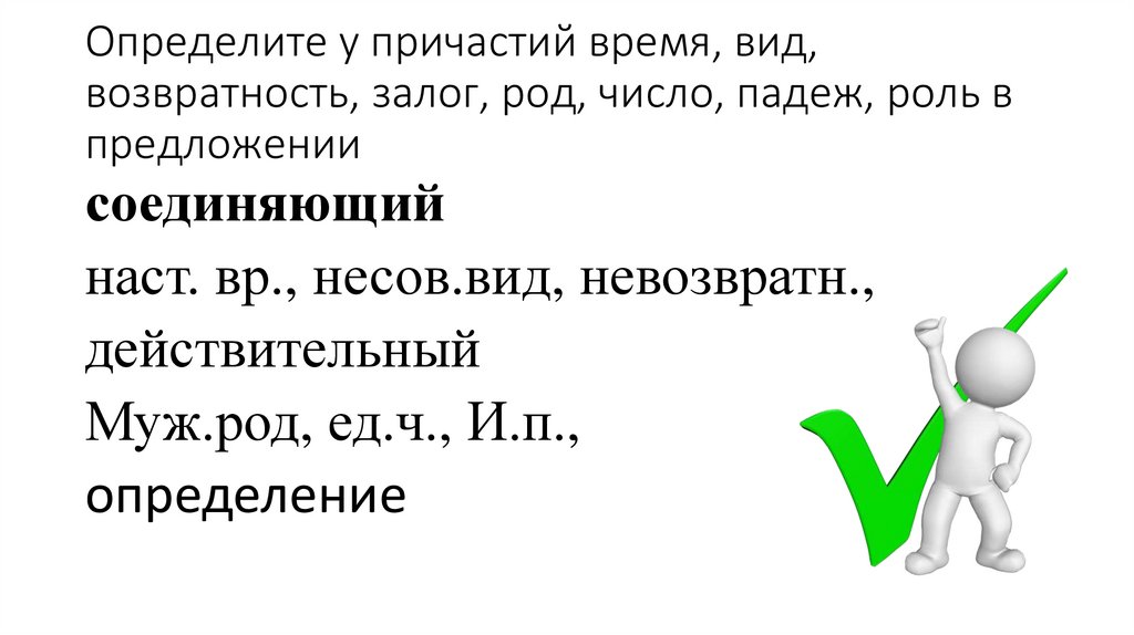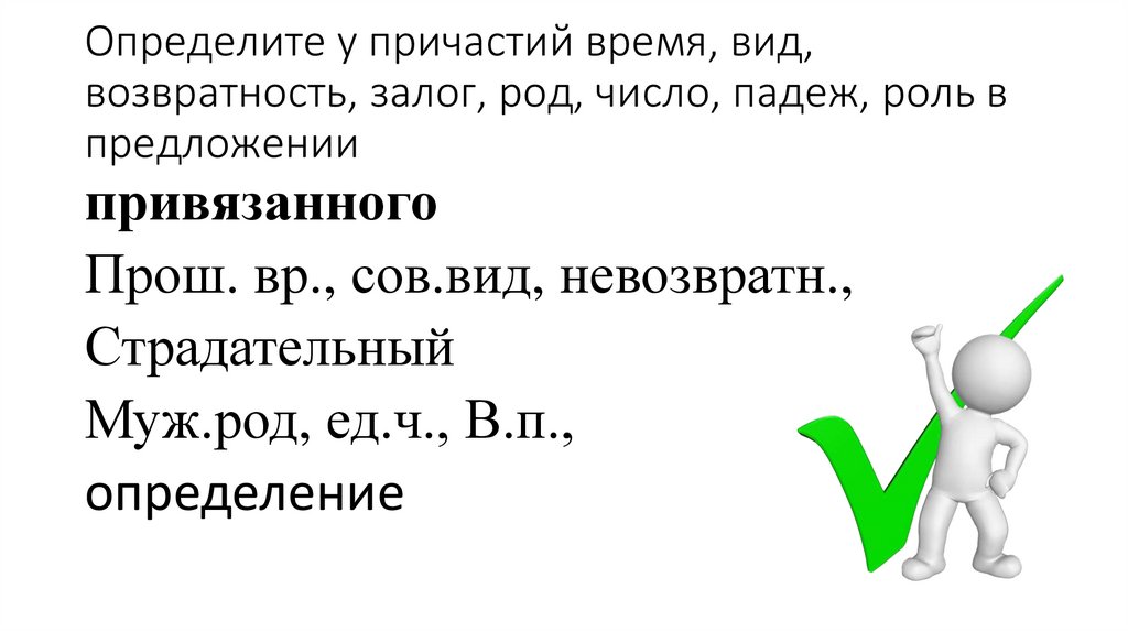 Определите у причастий время, вид,возвратность, залог, род, число, падеж, роль в