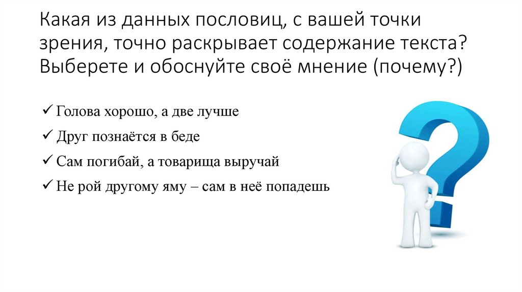 Какая из данных пословиц, с вашей точкизрения, точно раскрывает содержание текста?