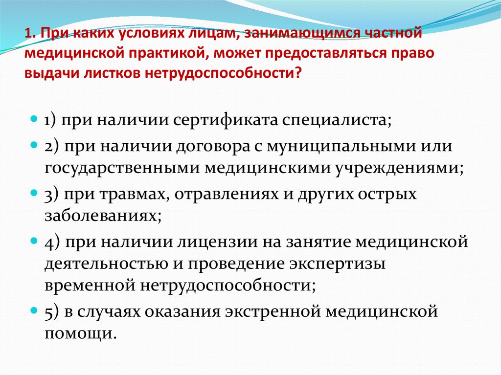 1. При каких условиях лицам, занимающимся частноймедицинской практикой, может предоставляться право