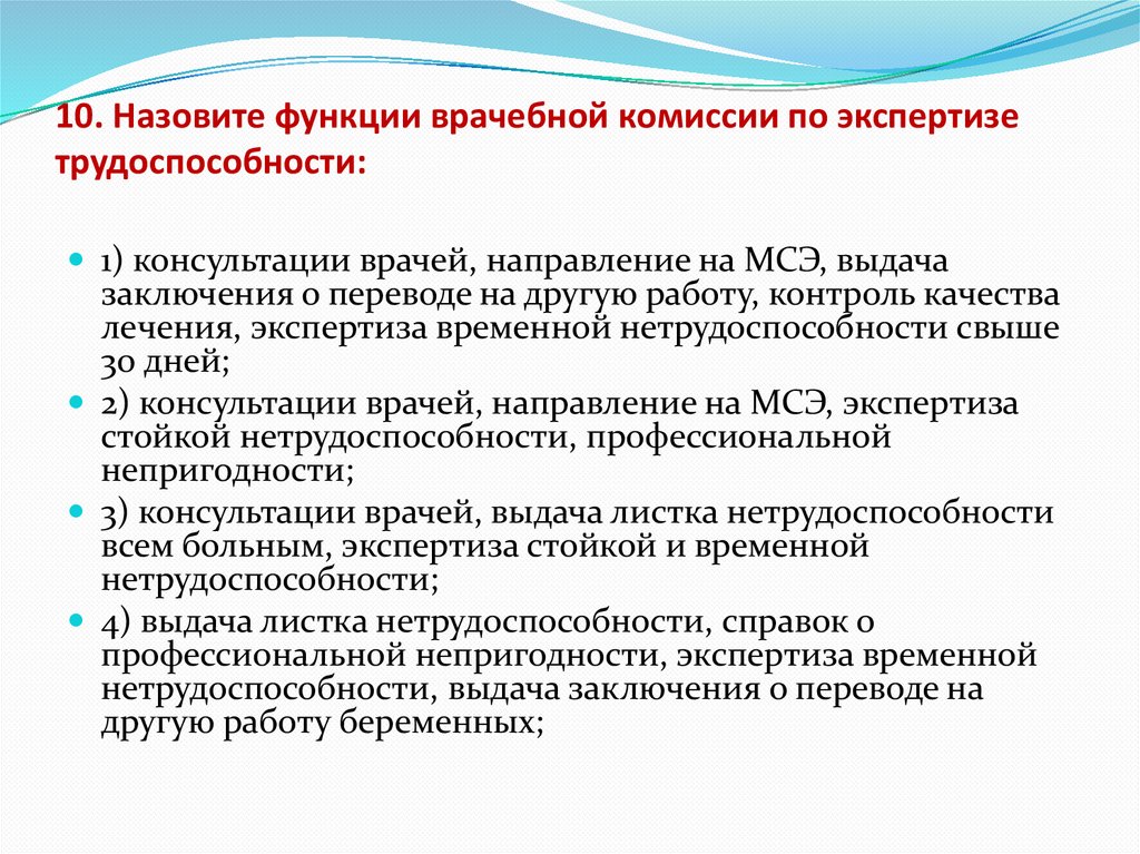 10. Назовите функции врачебной комиссии по экспертизетрудоспособности: