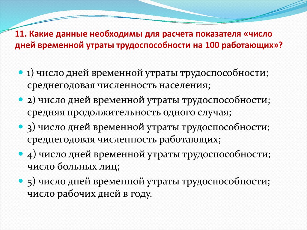 11. Какие данные необходимы для расчета показателя «числодней временной утраты трудоспособности на 100 работающих»?