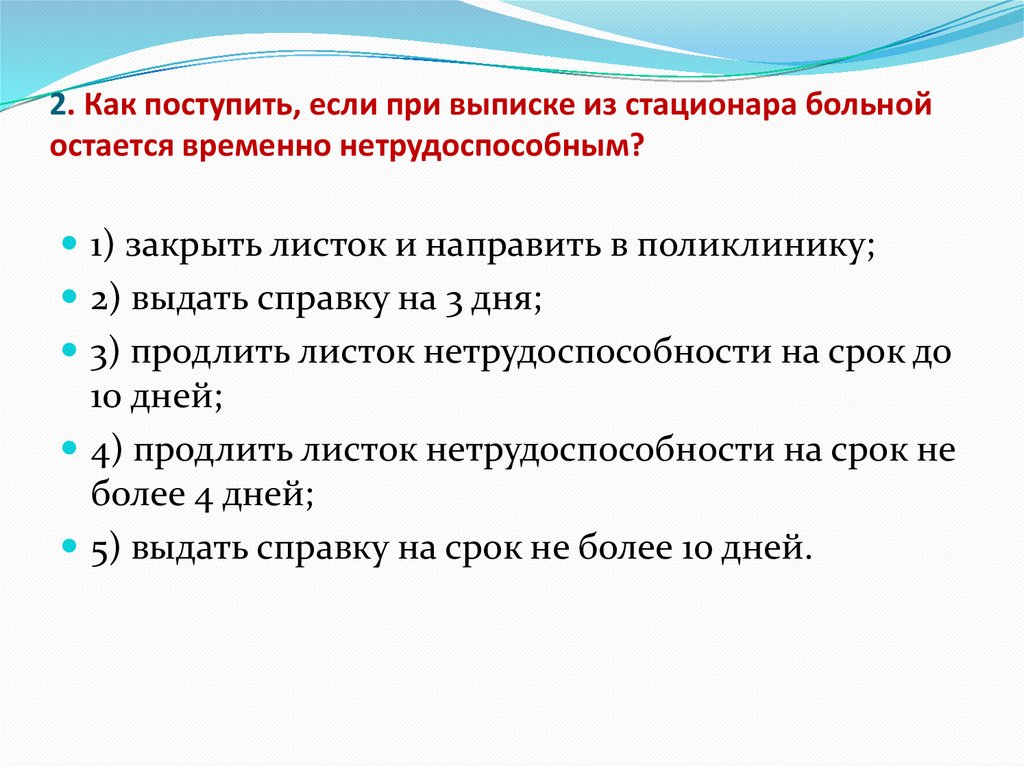 2. Как поступить, если при выписке из стационара больнойостается временно нетрудоспособным?