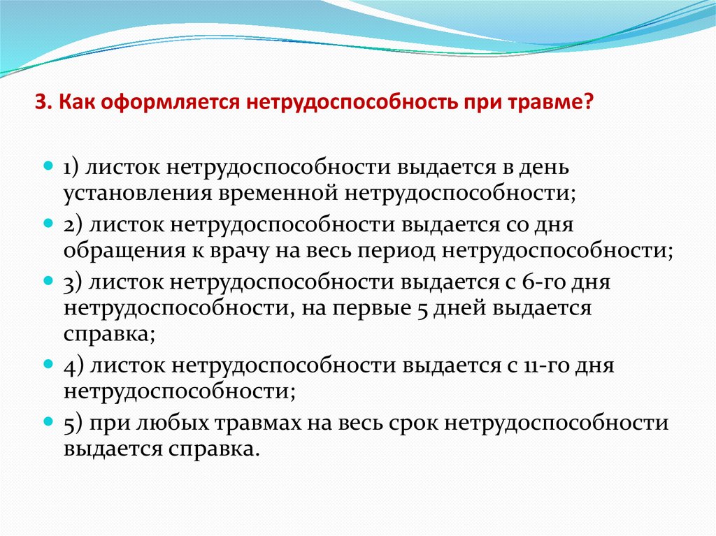 3. Как оформляется нетрудоспособность при травме?1) листок нетрудоспособности выдается в день