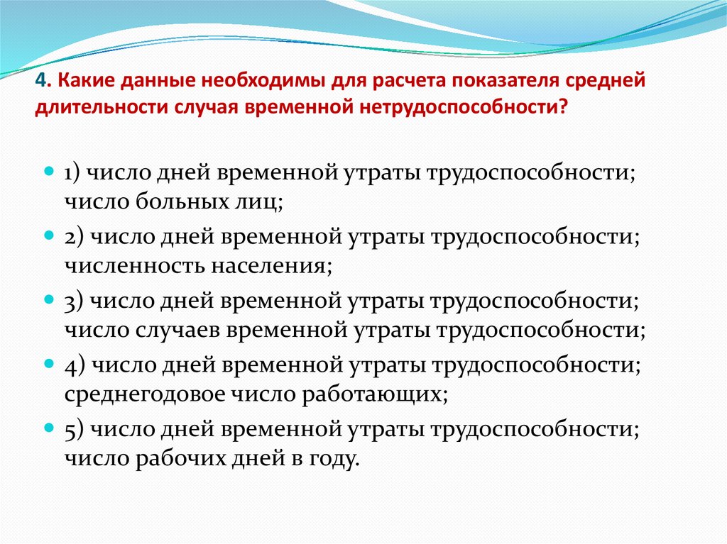 4. Какие данные необходимы для расчета показателя среднейдлительности случая временной нетрудоспособности?
