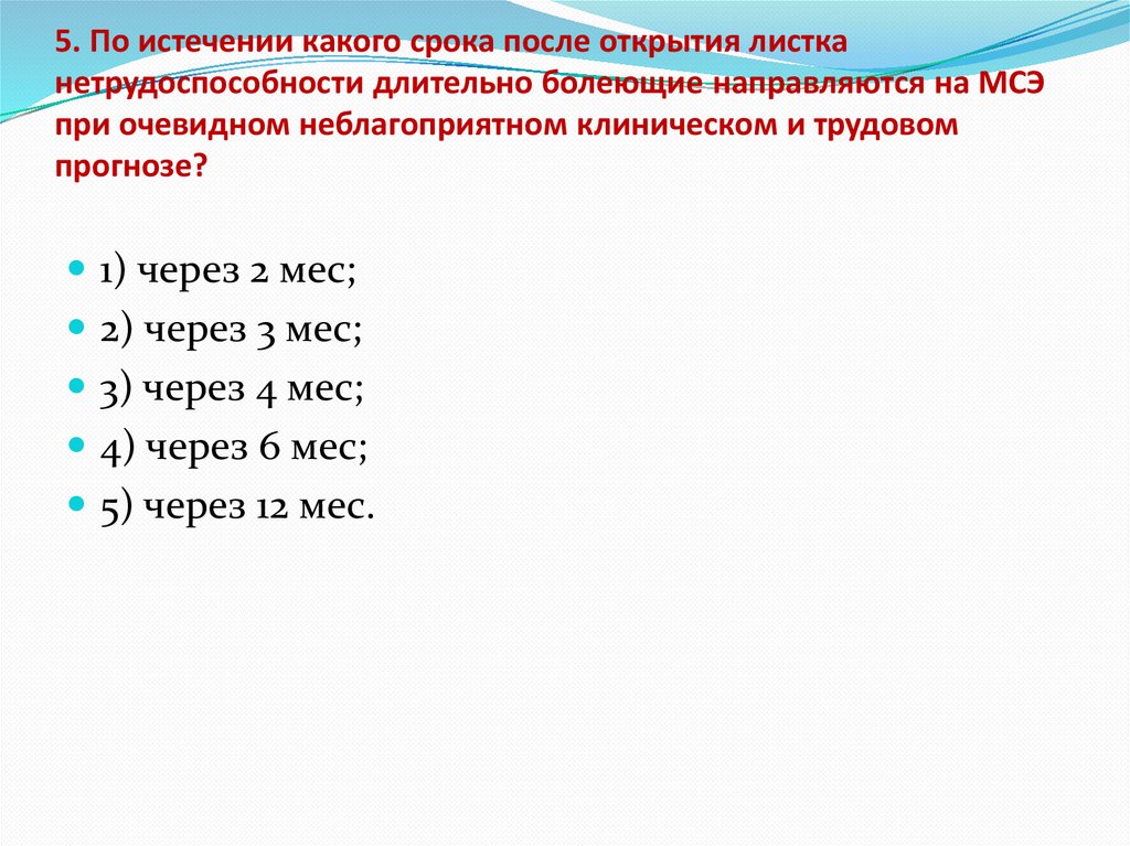 5. По истечении какого срока после открытия листканетрудоспособности длительно болеющие направляются на МСЭ