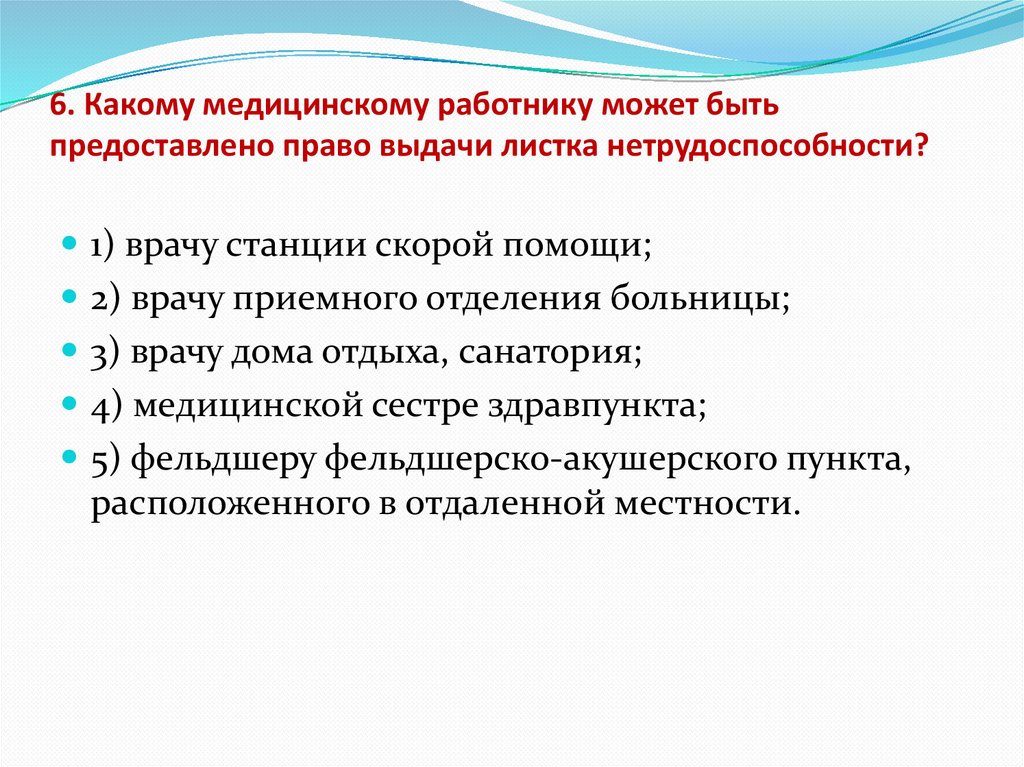 6. Какому медицинскому работнику может бытьпредоставлено право выдачи листка нетрудоспособности?