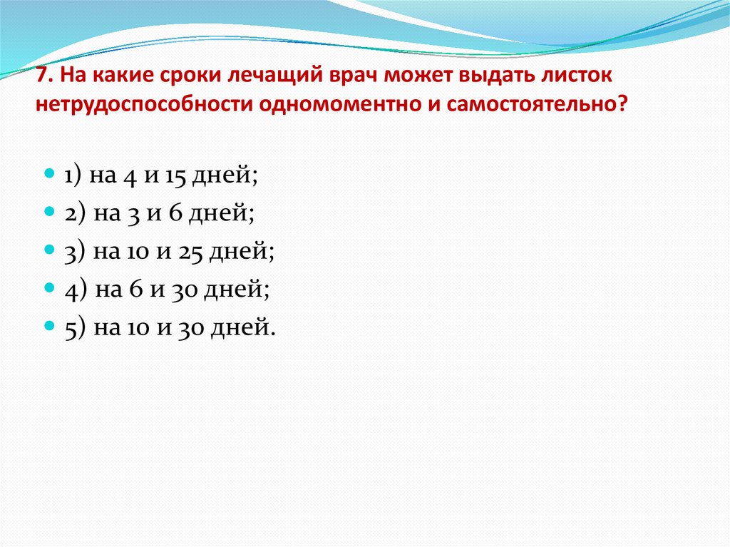 7. На какие сроки лечащий врач может выдать листокнетрудоспособности одномоментно и самостоятельно?