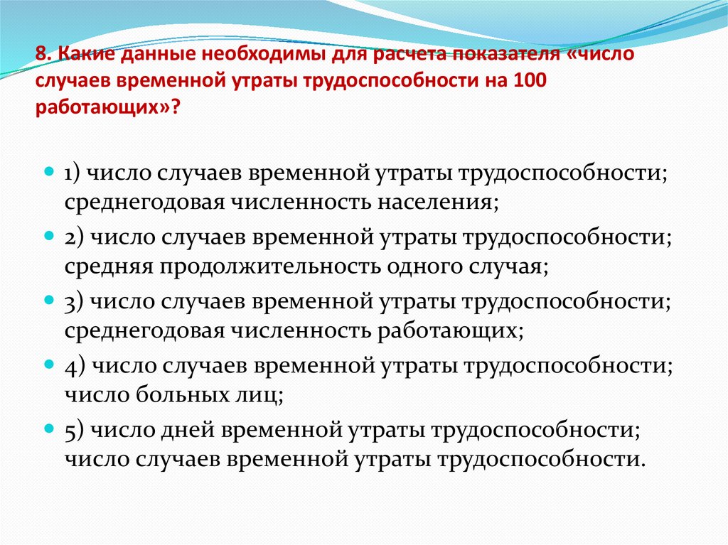 8. Какие данные необходимы для расчета показателя «числослучаев временной утраты трудоспособности на 100
