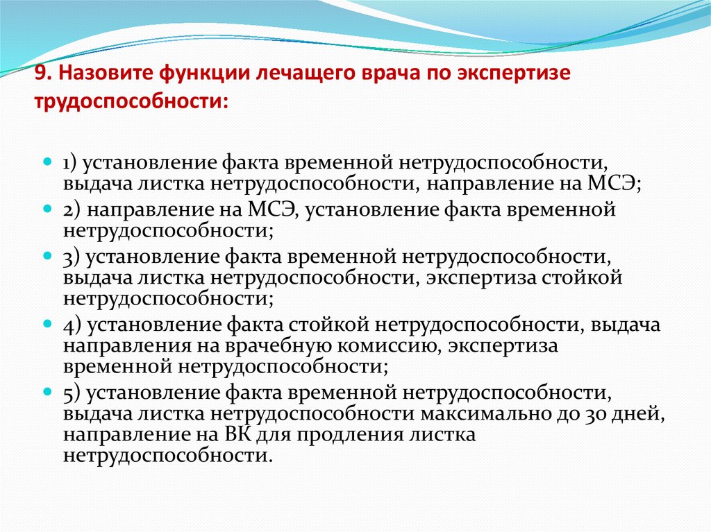 9. Назовите функции лечащего врача по экспертизетрудоспособности: