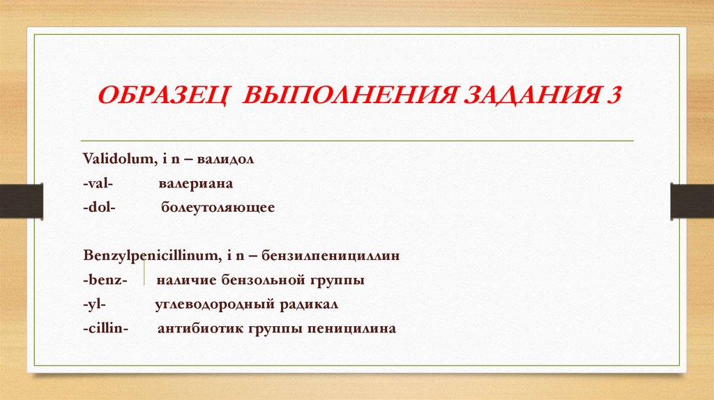 ОБРАЗЕЦ ВЫПОЛНЕНИЯ ЗАДАНИЯ 3Validolum, i n – валидол