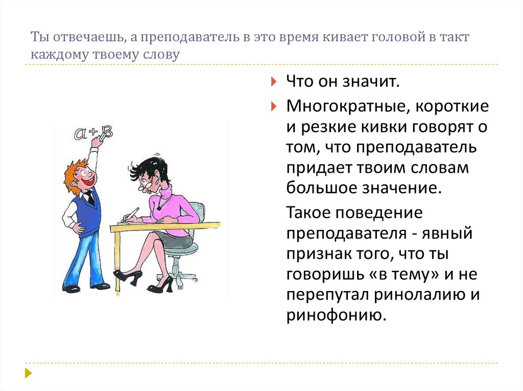 Ты отвечаешь, а преподаватель в это время кивает головой в такткаждому твоему слову