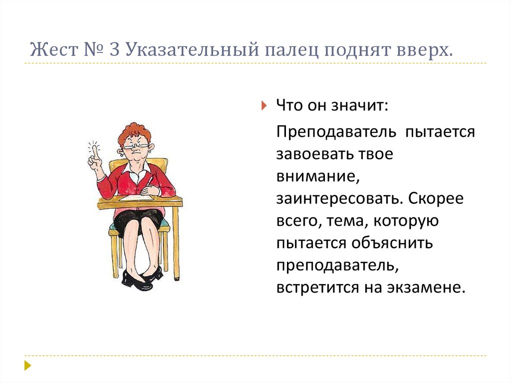 Жест № 3 Указательный палец поднят вверх.Что он значит: