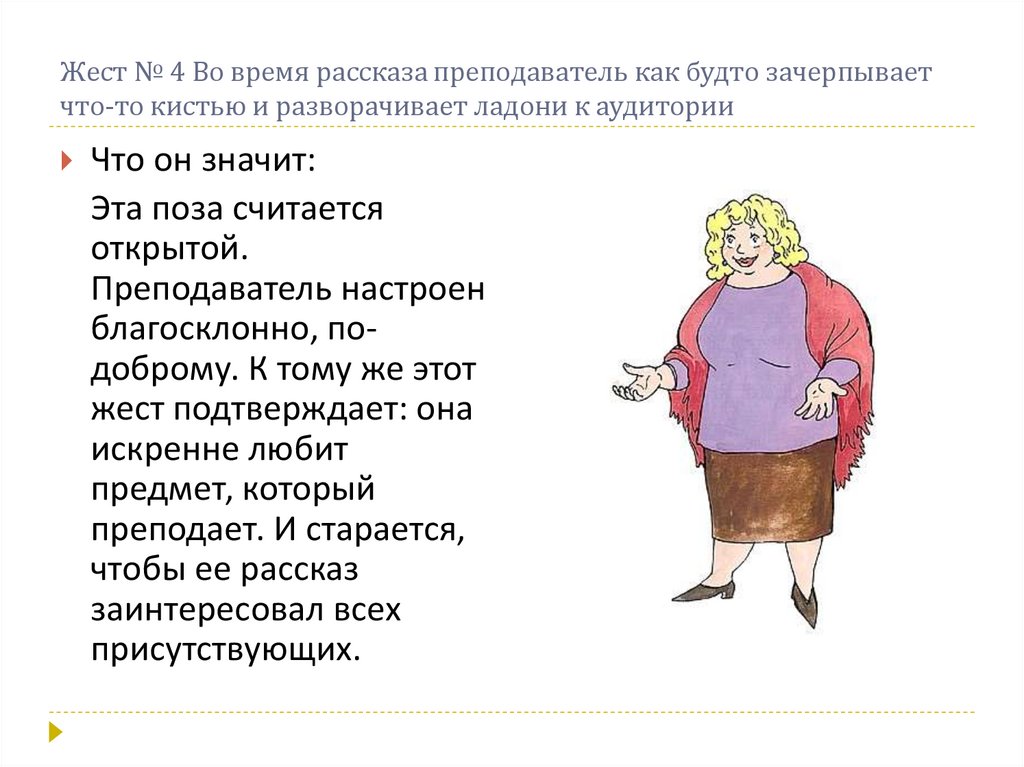 Жест № 4 Во время рассказа преподаватель как будто зачерпываетчто-то кистью и разворачивает ладони к аудитории