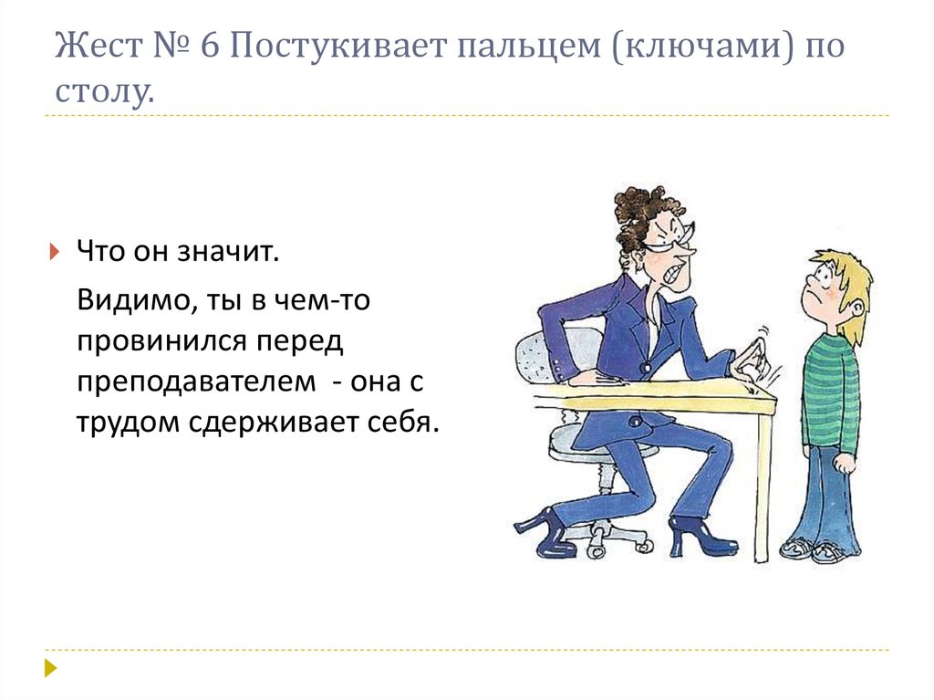Жест № 6 Постукивает пальцем (ключами) постолу.