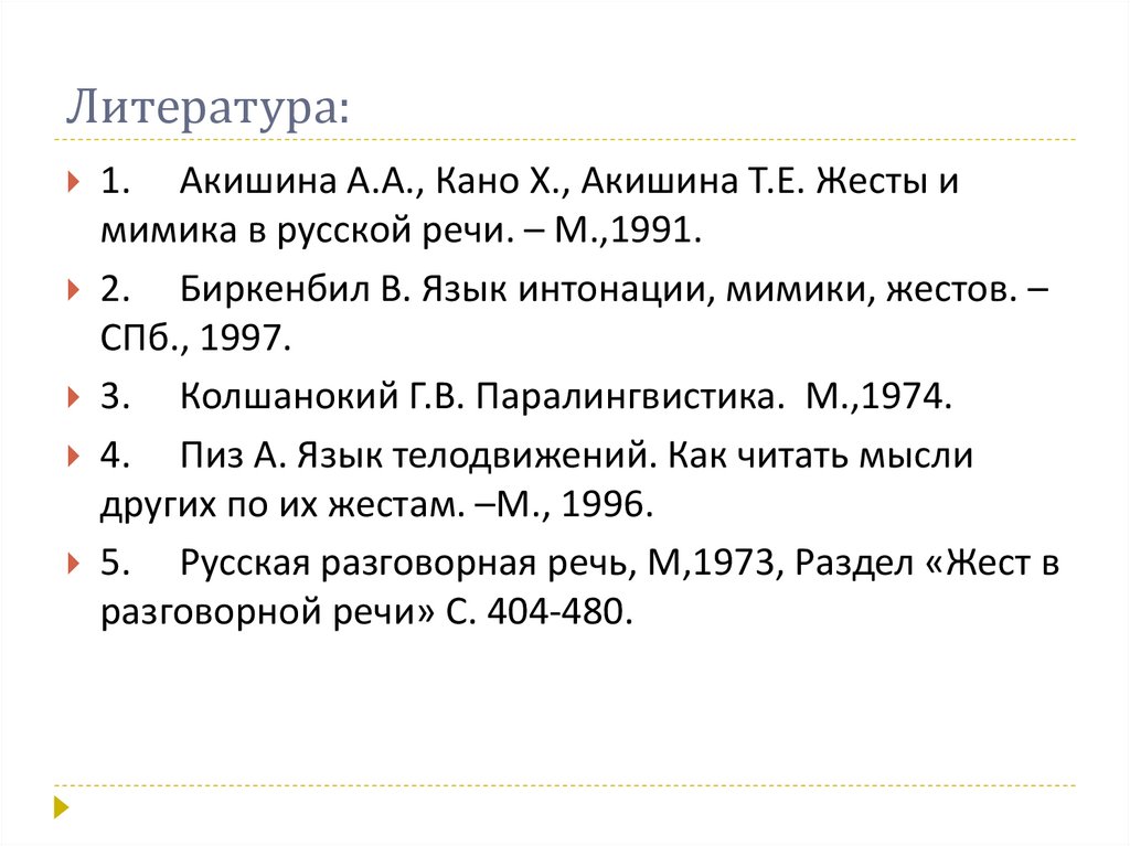 Литература:1. Акишина А.А., Кано Х., Акишина Т.Е. Жесты и