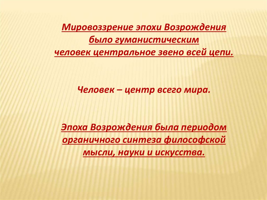 Мировоззрение эпохи Возрождениябыло гуманистическим