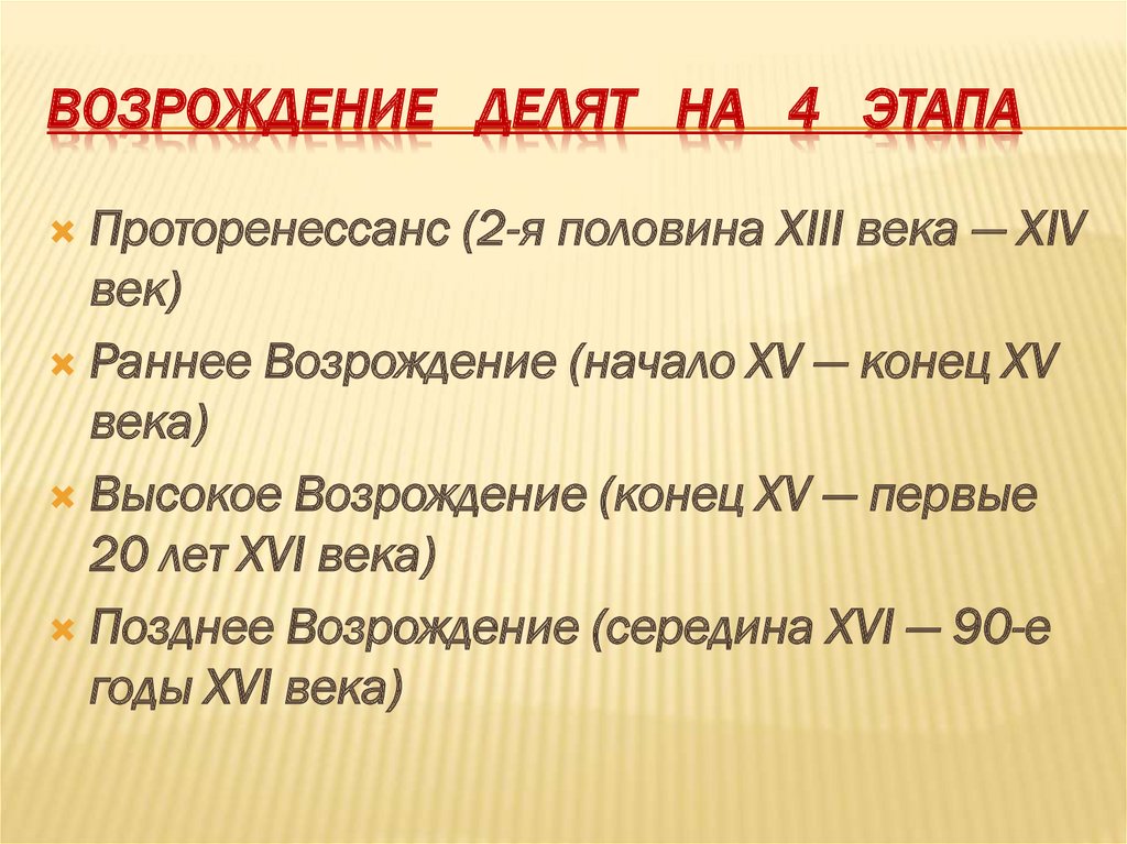 ВОЗРОЖДЕНИЕ ДЕЛЯТ НА 4 ЭТАПАПроторенессанс (2-я половина XIII века — XIV