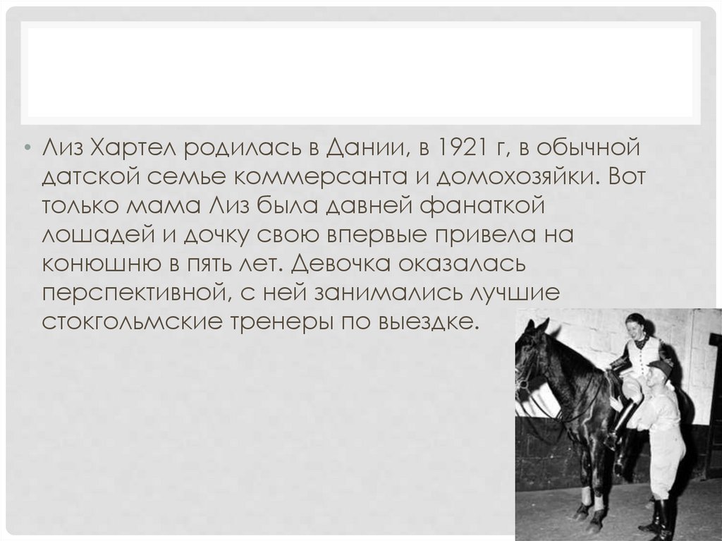 • Лиз Хартел родилась в Дании, в 1921 г, в обычнойдатской семье коммерсанта и домохозяйки. Вот