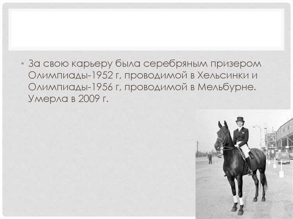 • За свою карьеру была серебряным призеромОлимпиады-1952 г, проводимой в Хельсинки и