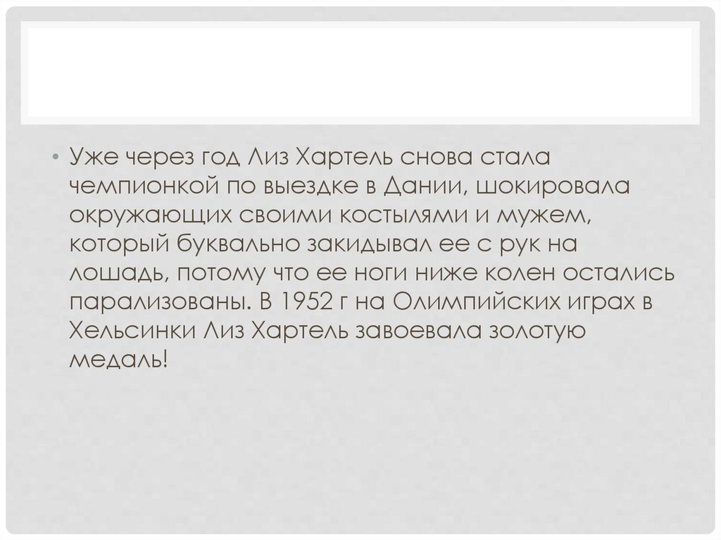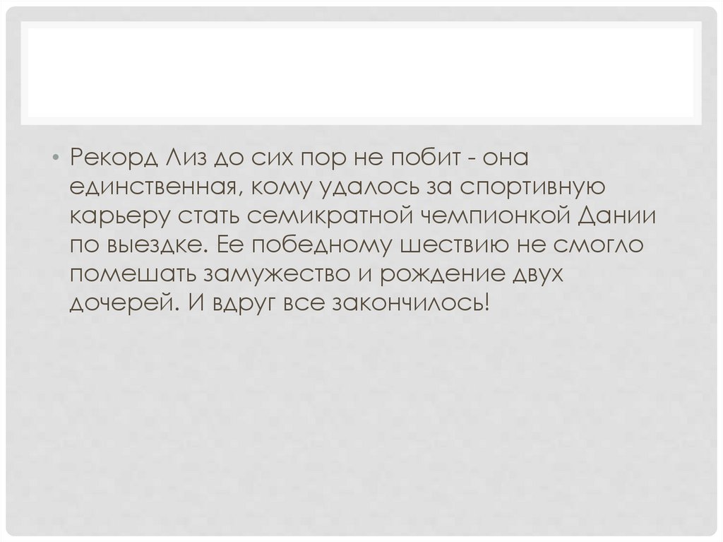 • Уже через год Лиз Хартель снова сталачемпионкой по выездке в Дании, шокировала