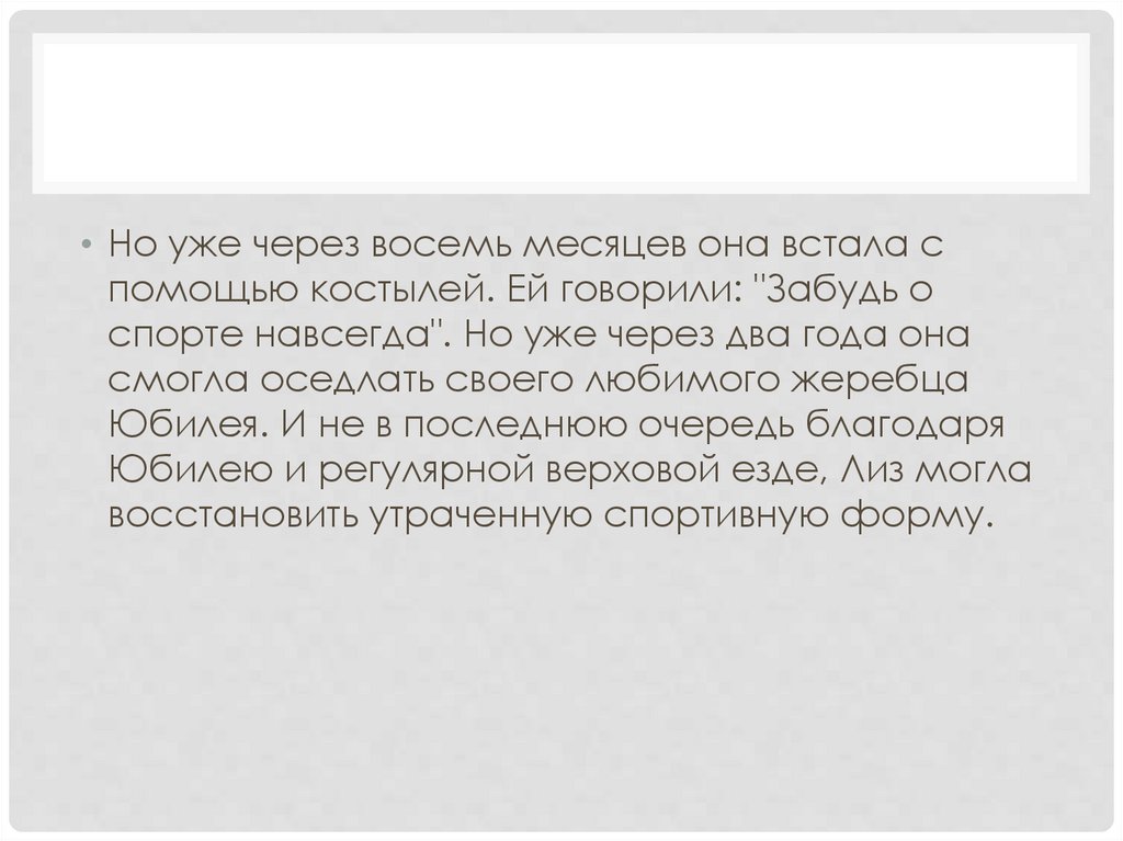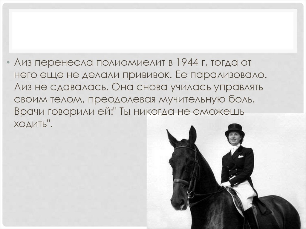 • Лиз перенесла полиомиелит в 1944 г, тогда отнего еще не делали прививок. Ее парализовало.