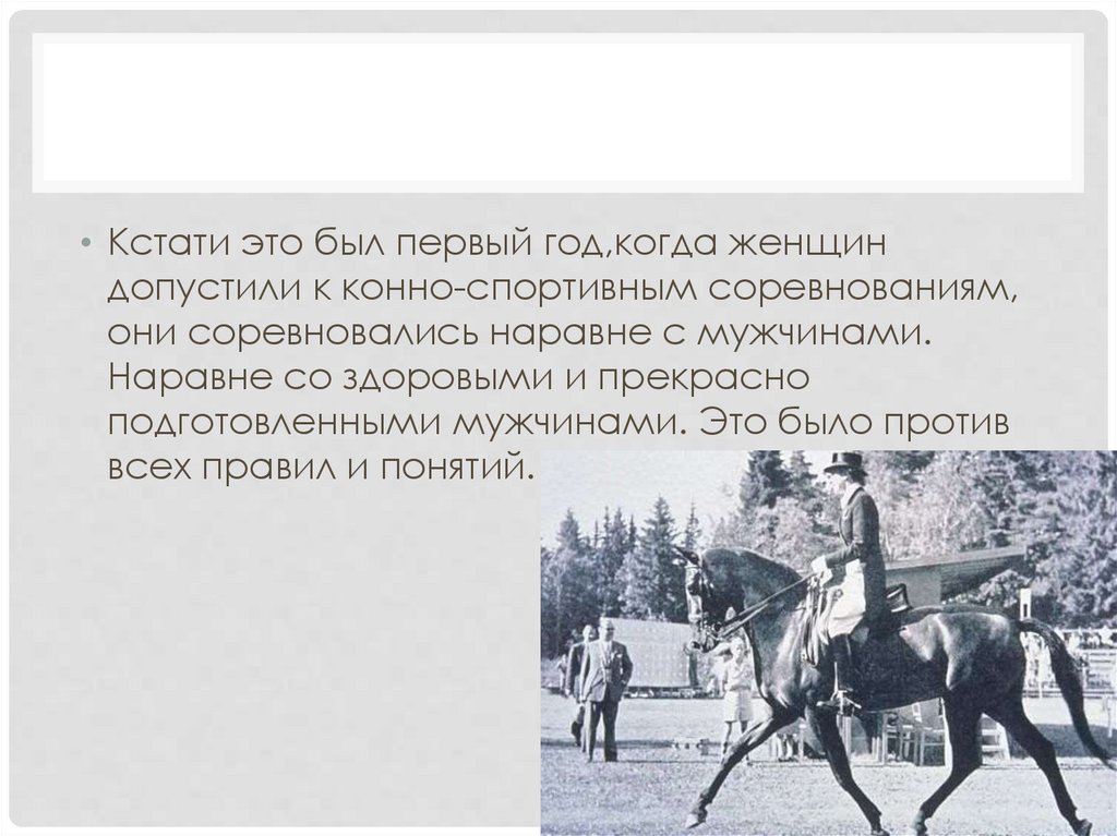 • Кстати это был первый год,когда женщиндопустили к конно-спортивным соревнованиям,