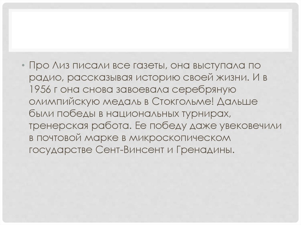 • Про Лиз писали все газеты, она выступала порадио, рассказывая историю своей жизни. И в