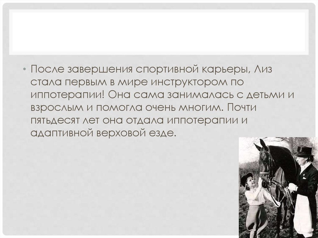 • С Лиз Хартель и началась современная историяиппотерапии в мире. Одна сильная и красивая