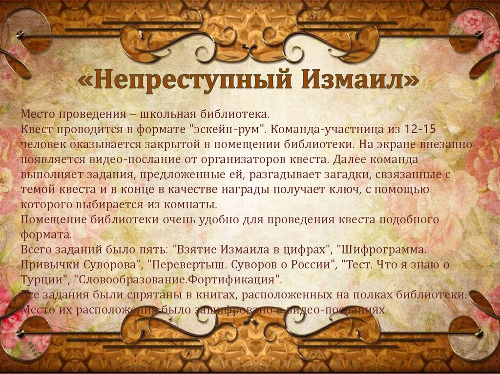 Всего заданий было пять: "Взятие Измаила в цифрах", "Шифрограмма.