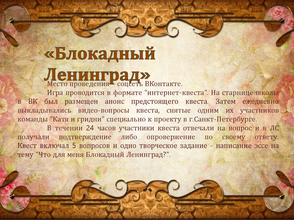 Место проведения – соцсеть ВКонтакте.Игра проводится в формате "интернет-квеста". На старнице школы