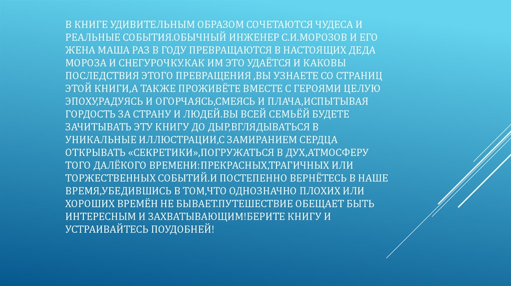 В КНИГЕ УДИВИТЕЛЬНЫМ ОБРАЗОМ СОЧЕТАЮТСЯ ЧУДЕСА ИРЕАЛЬНЫЕ СОБЫТИЯ.ОБЫЧНЫЙ ИНЖЕНЕР С.И.МОРОЗОВ И ЕГО