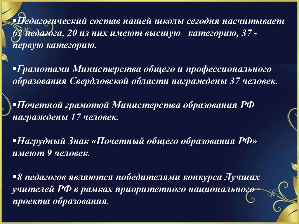 Педагогический состав нашей школы сегодня насчитывает62 педагога, 20 из них имеют высшую категорию, 37 первую категорию.