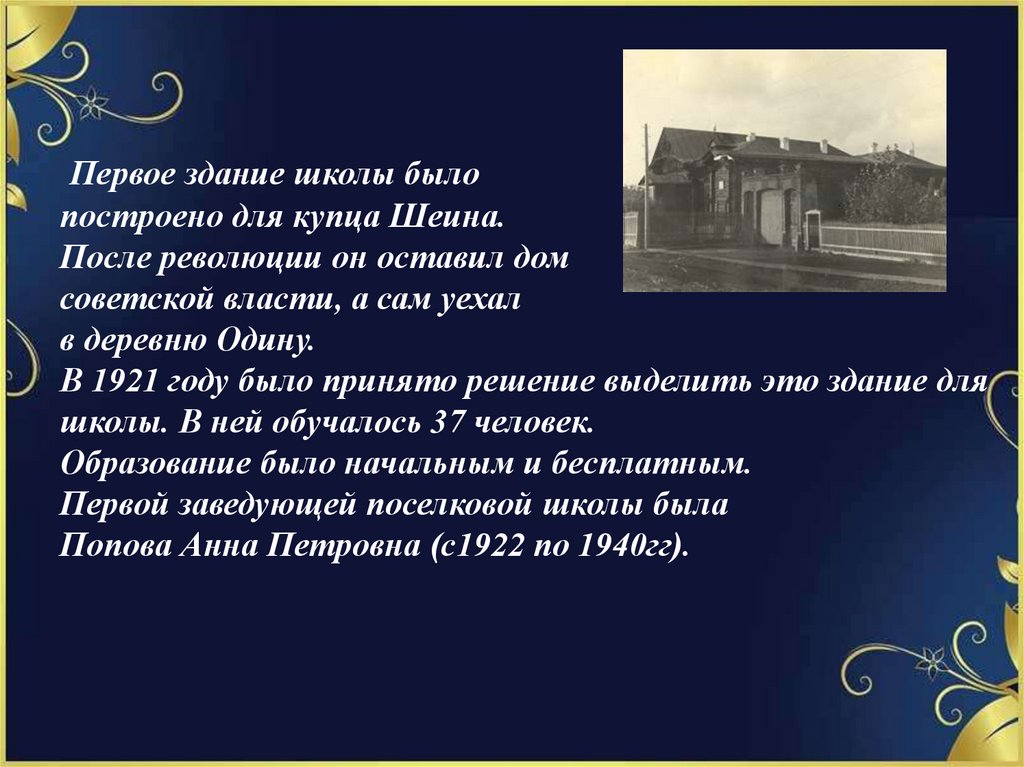 Первое здание школы былопостроено для купца Шеина.
