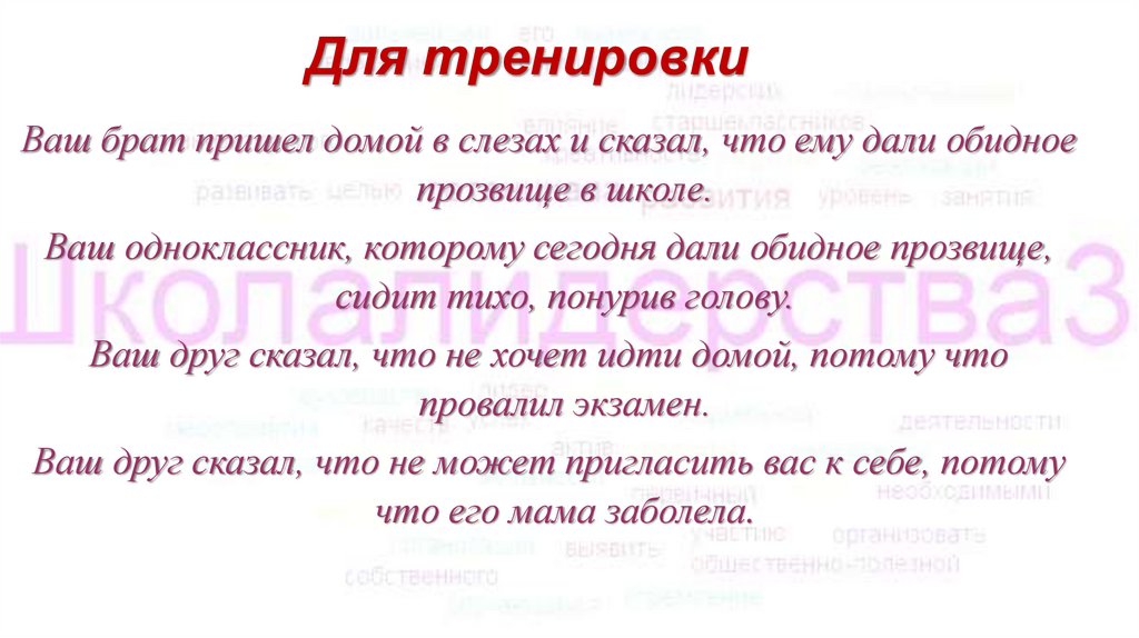 Для тренировкиВаш брат пришел домой в слезах и сказал, что ему дали обидное