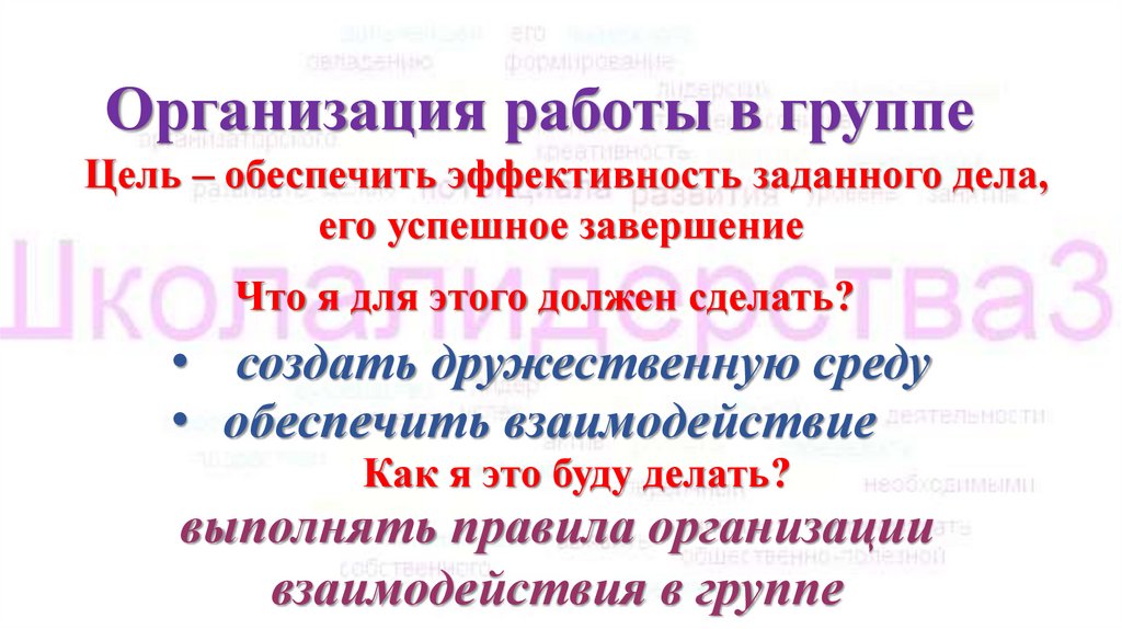 Организация работы в группеЦель – обеспечить эффективность заданного дела,