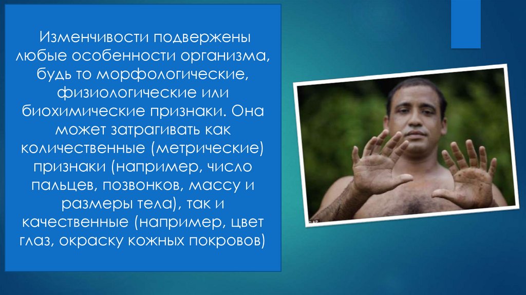 Изменчивости подверженылюбые особенности организма,