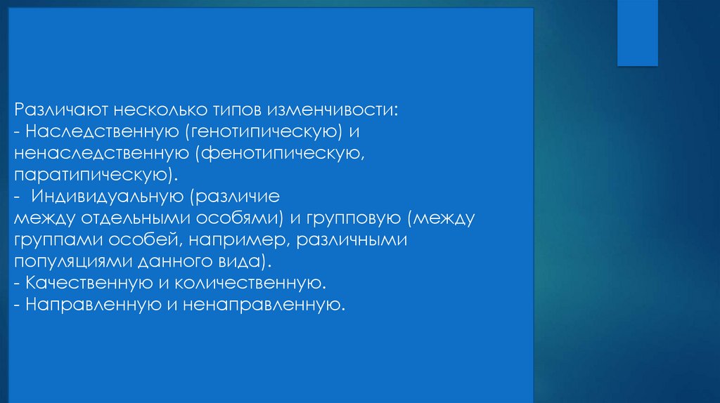 Различают несколько типов изменчивости:- Наследственную (генотипическую) и