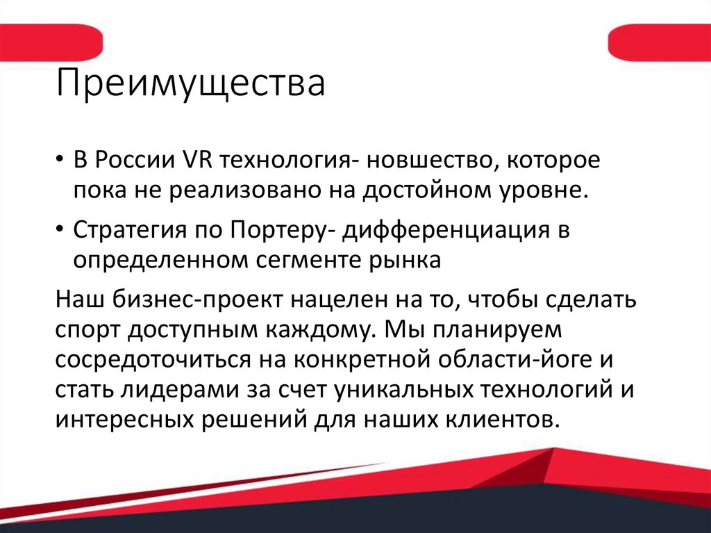 Преимущества• В России VR технология- новшество, которое