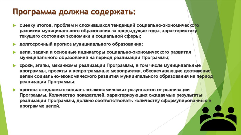 Программа должна содержать:оценку итогов, проблем и сложившихся тенденций социально-экономического