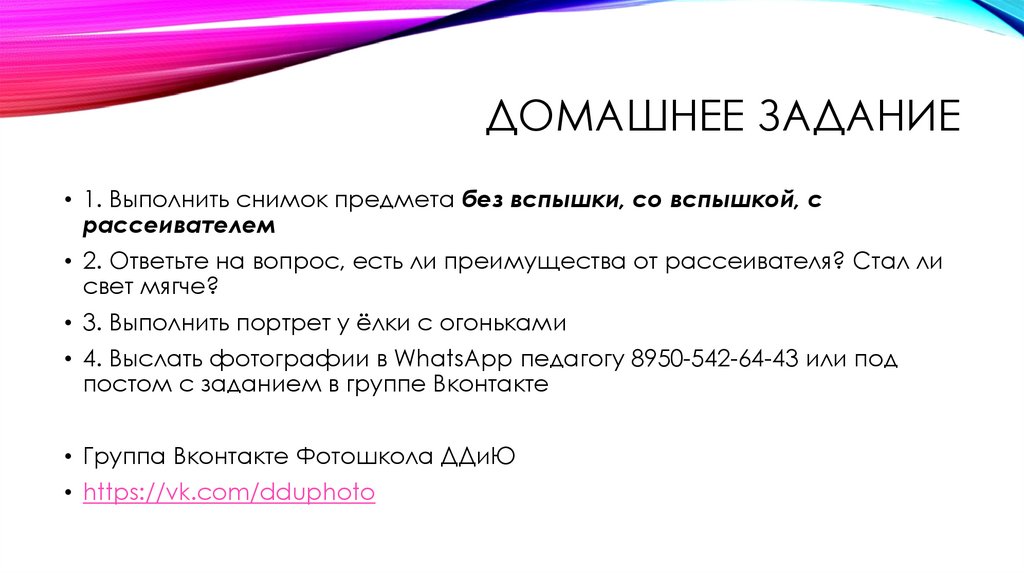 ДОМАШНЕЕ ЗАДАНИЕ• 1. Выполнить снимок предмета без вспышки, со вспышкой, с