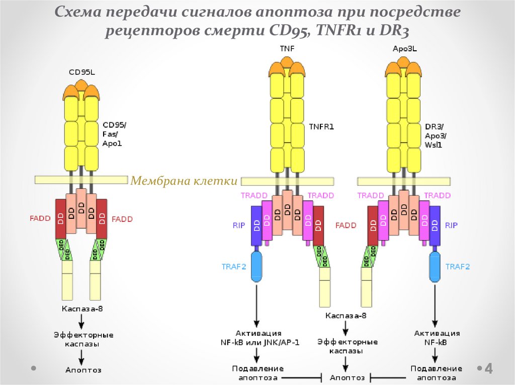 Схема передачи сигналов апоптоза при посредстверецепторов смерти CD95, TNFR1 и DR3