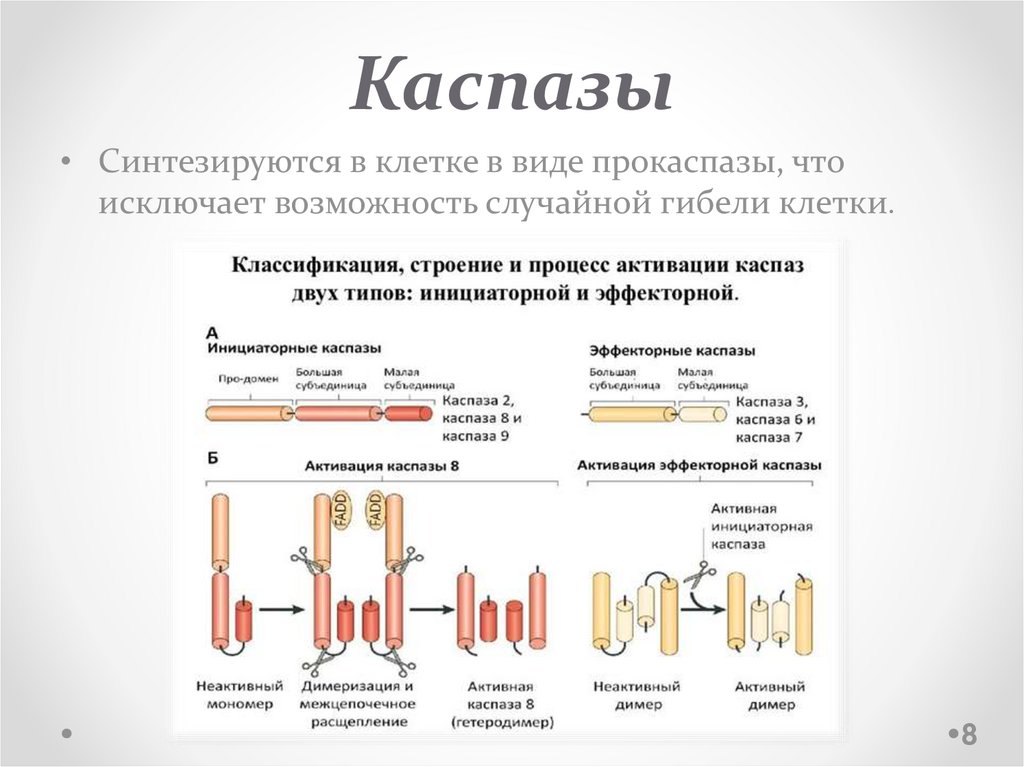 Каспазы• Синтезируются в клетке в виде прокаспазы, что