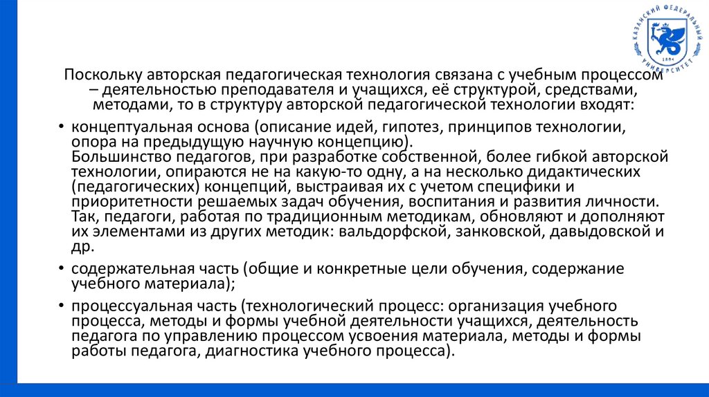 Поскольку авторская педагогическая технология связана с учебным процессом– деятельностью преподавателя и учащихся, её структурой, средствами,